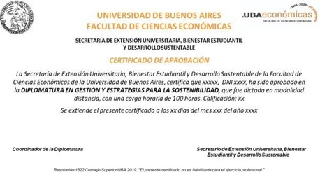 El mismo será en formato digital con logo de la Universidad y Facultad de Ciencias Económicas. Emitido por la Secretaría de Extensión Universitaria, Bienestar Estudiantil y Desarrollo Sustentable de la Facultad. Firmado por el Secretario y el responsable de la Diplomatura.